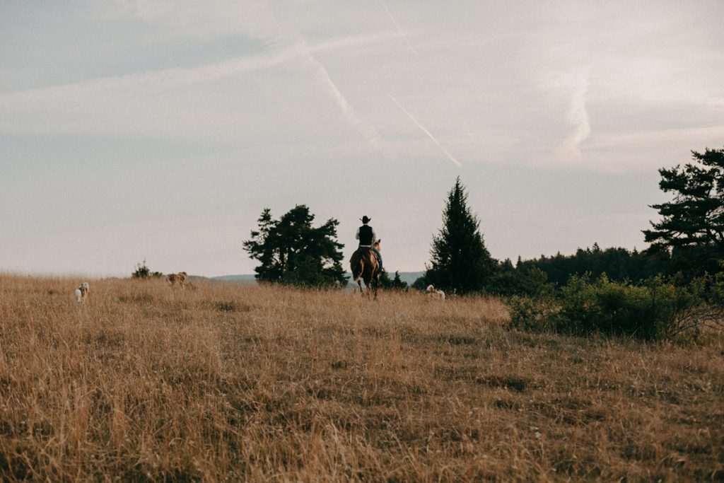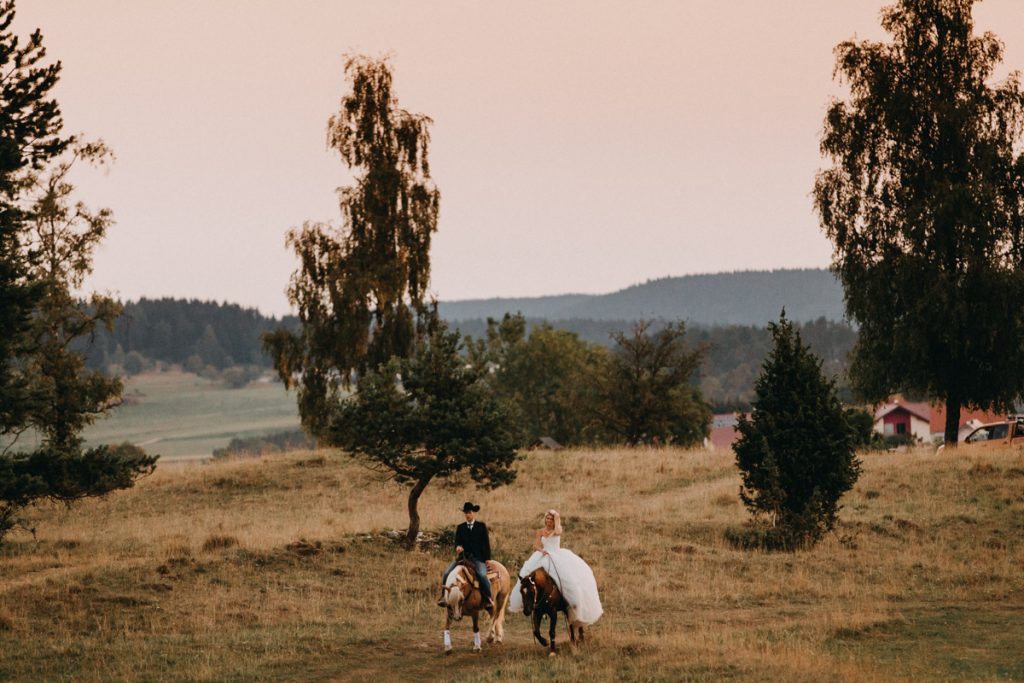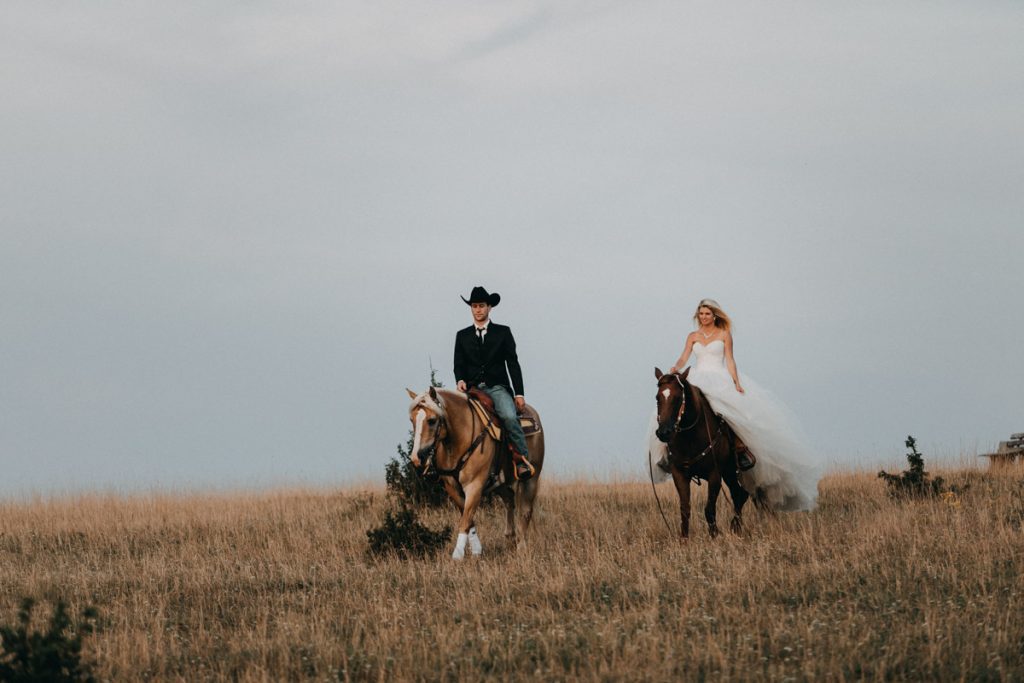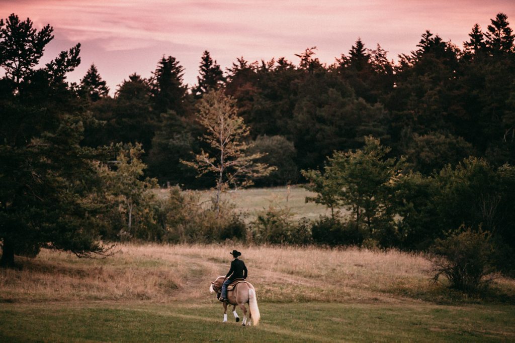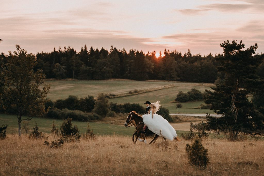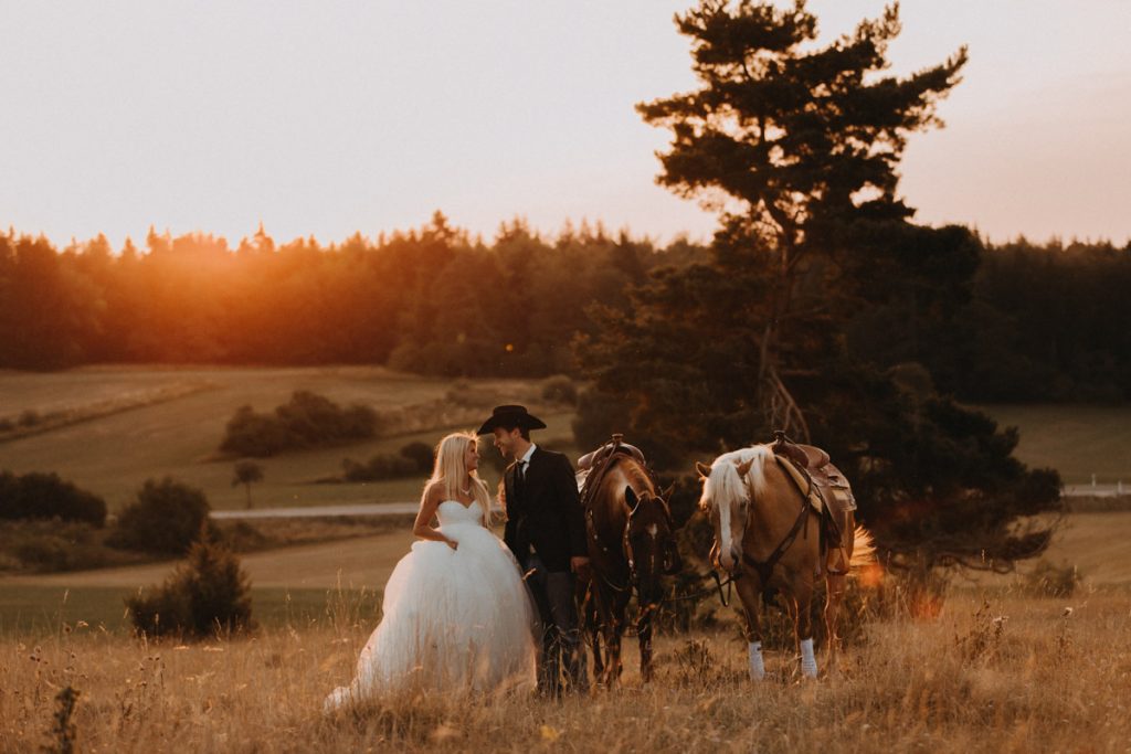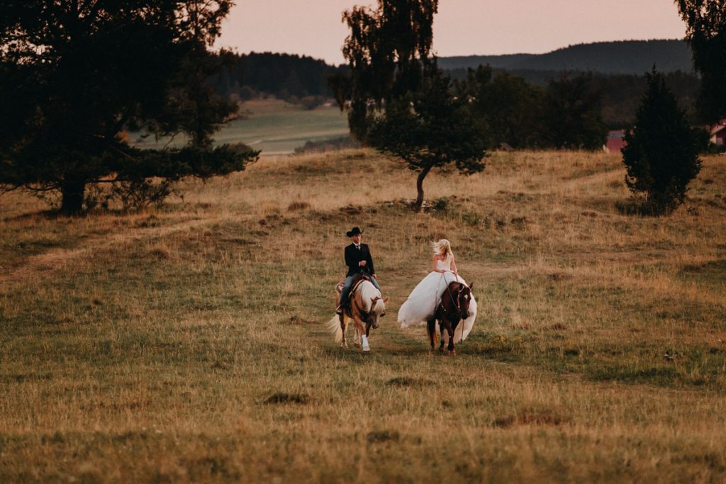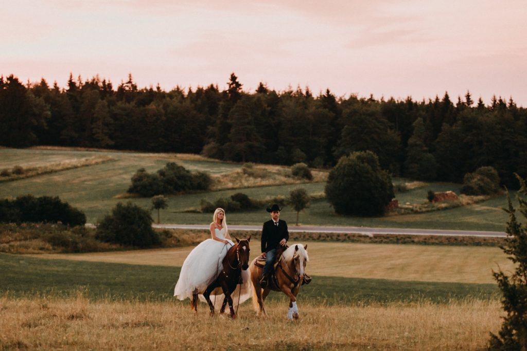 Hoch auf den Pferden ritten die erfahrenen Reiter dem Sonnenaufgang entgegen. Magisches Licht und eine Hochstimmung, bescherten uns stimmungsvolle und außergewöhnliche After Wedding Bilder.