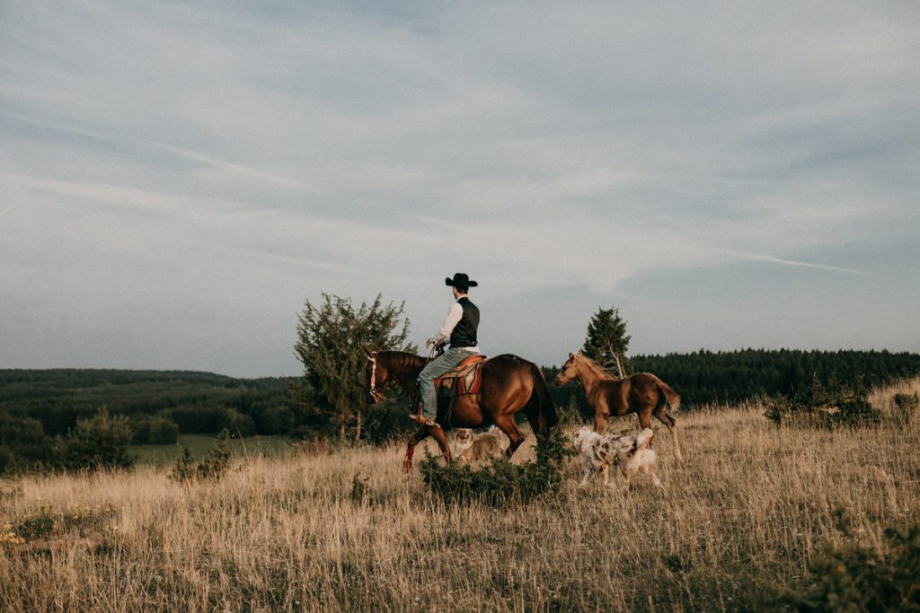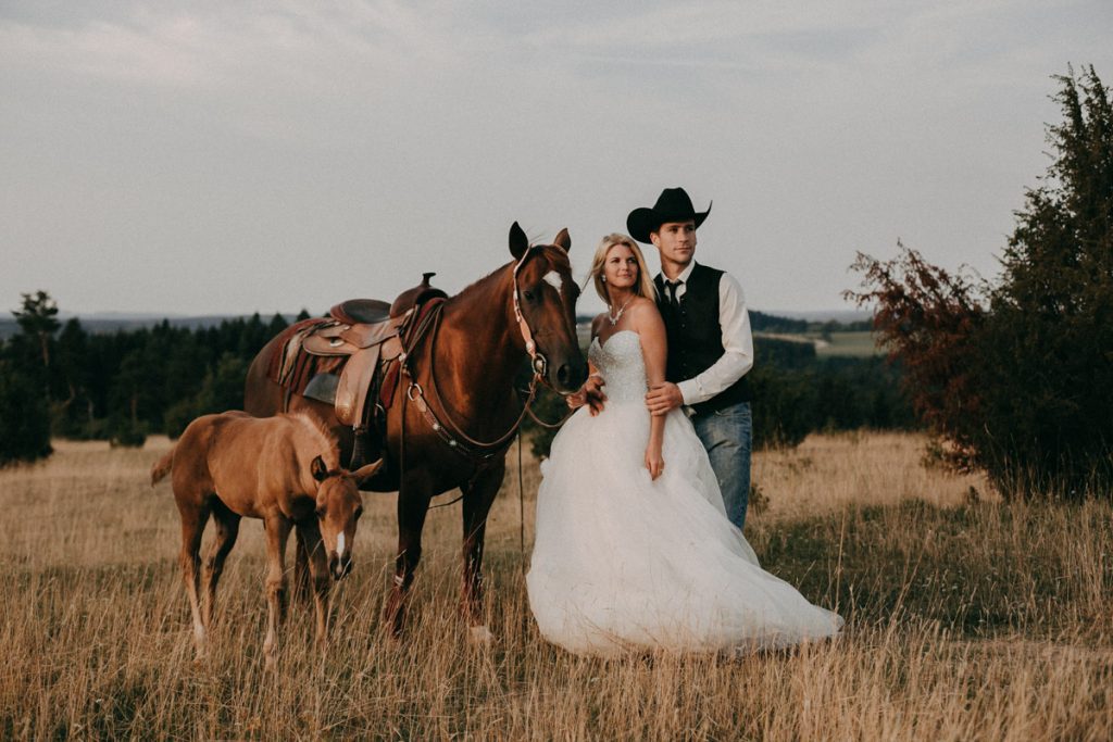 Am frühen Morgen trafen wir uns auf dem Alten Berg bei Böttingen zu einem tierischen After Wedding Shooting. Neben zwei Pferden und einem jungen Fohlen durften auch die 3 Hunde das frisch gebackene Ehepaar begleiten.